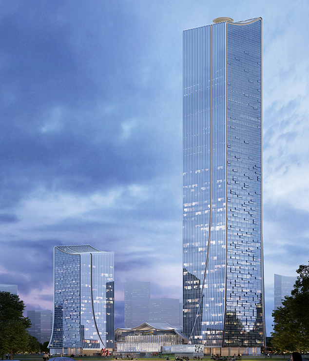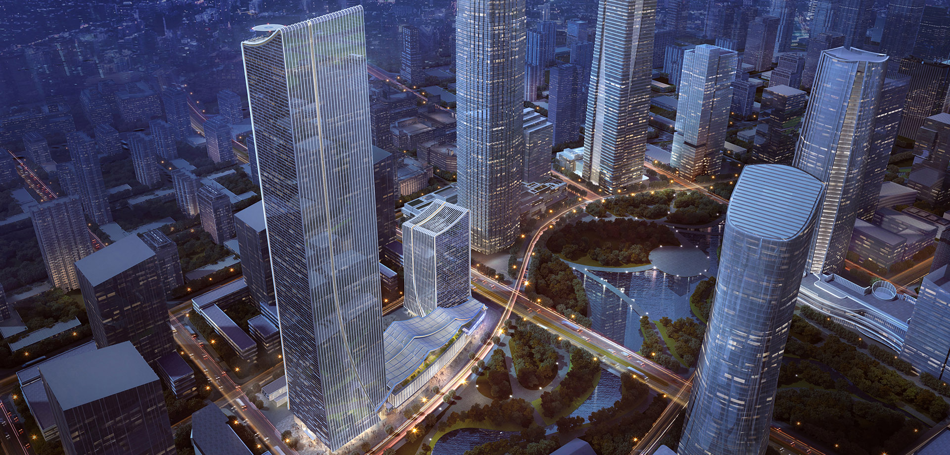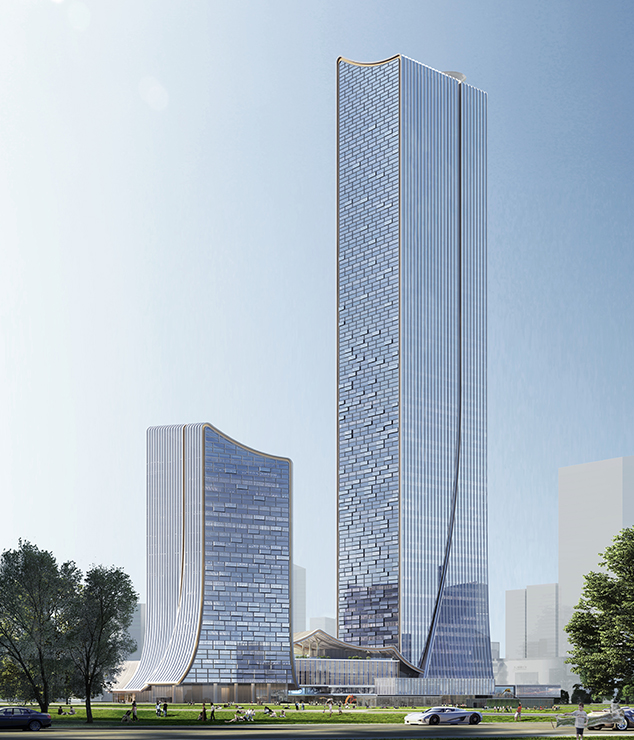 建筑高度:326.1m(65層) 幕墻面積:7.1萬m2 項目設(shè)計:Aedas建筑設(shè)計事務(wù)所 幕墻類型:單元式玻璃幕墻等