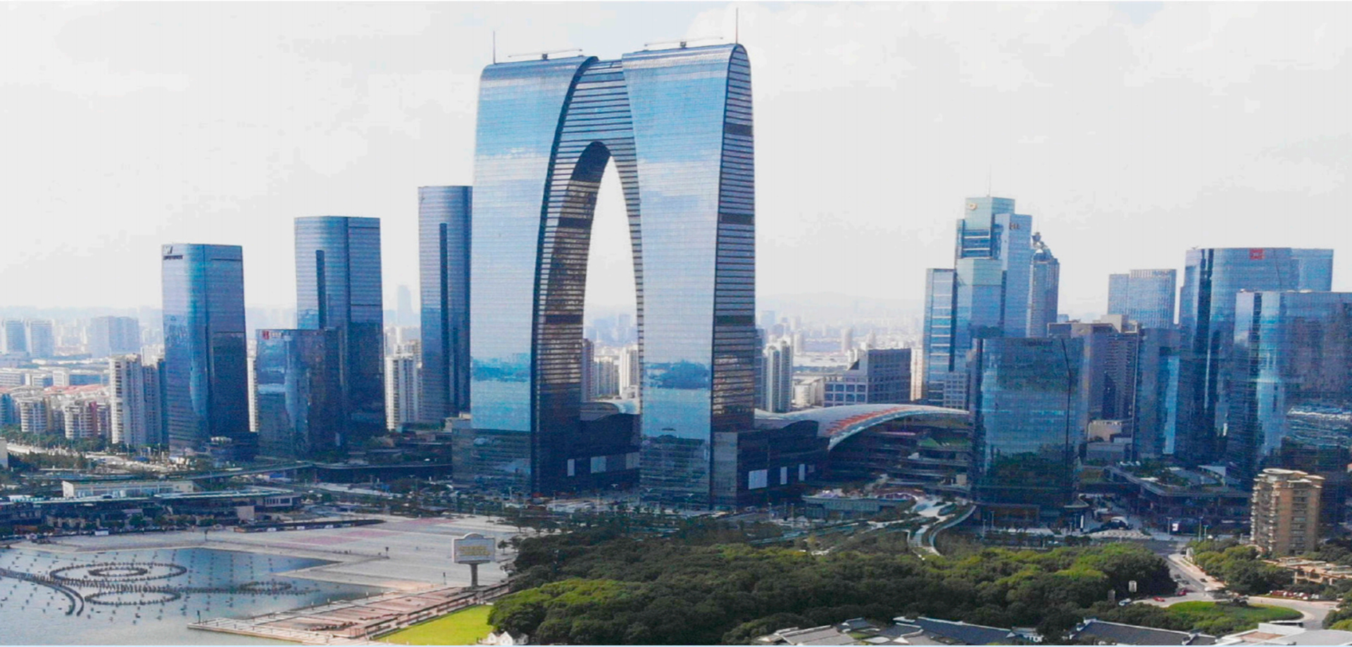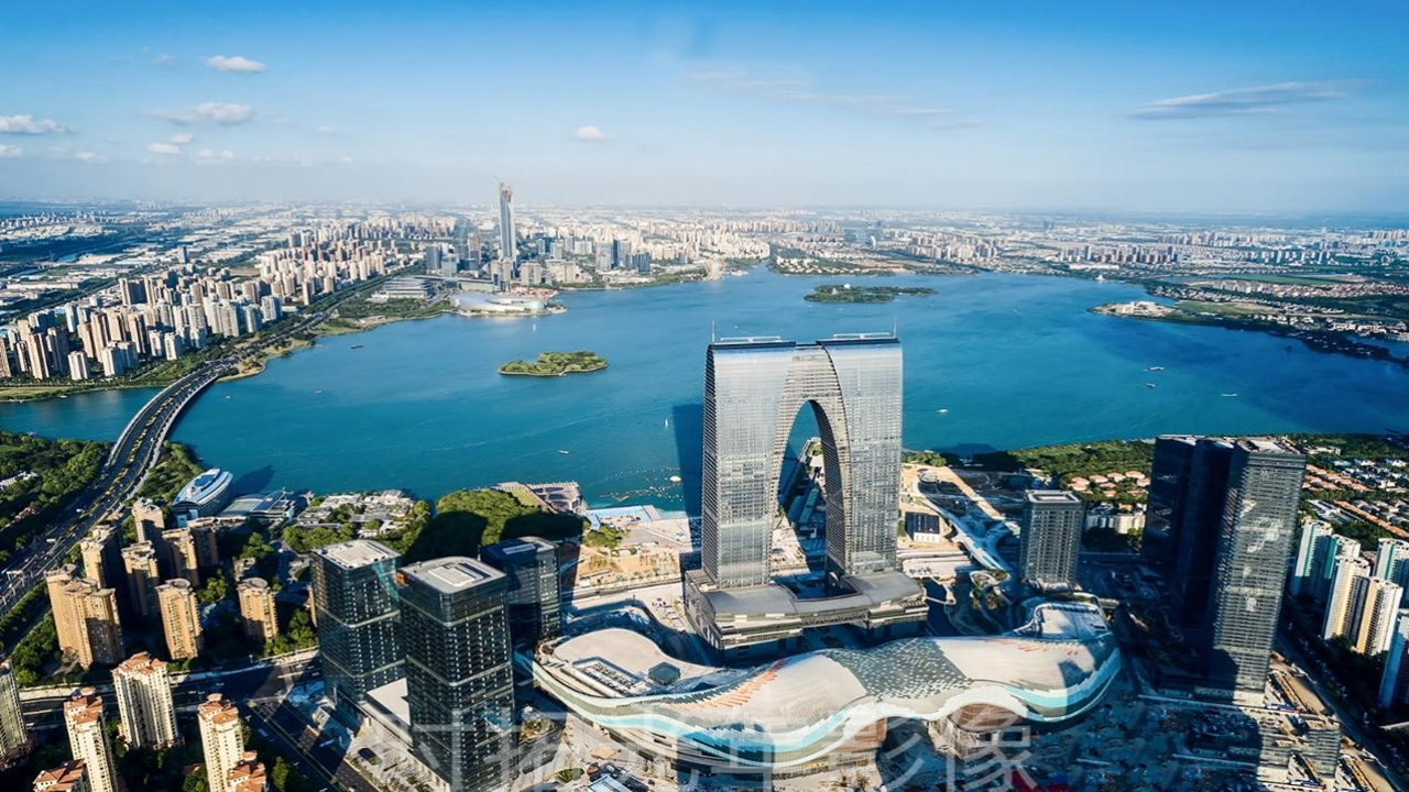 蘇州中心廣場項目位于蘇州工業(yè)園區(qū)金雞湖西側,毗鄰東方之門,居蘇州市域CBD核心位置,軌交1號線、6號線貫穿整個項目區(qū)域,整體占地21.1公頃,凈地面積13.9公頃,總建筑面積約182萬平方米,其中地上建筑面積130萬平方米、地下建筑面積52萬平方米。