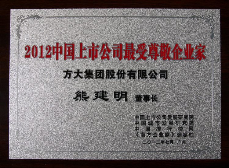 2012年7月30日,“2012中國上市公司最具投資價(jià)值100強(qiáng)”排行榜在廣州揭曉,方大集團(tuán)榮登“中國上市公司最具投資價(jià)值100強(qiáng)”榜單,熊建明董事長榮膺“2012中國上市公司最受尊敬企業(yè)家”。
