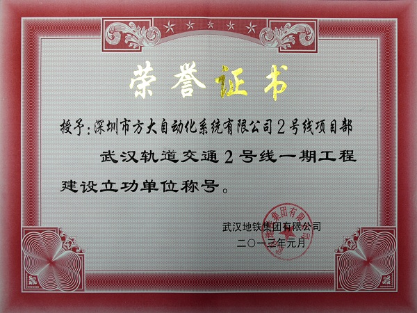 近日,為表彰方大自動化系統(tǒng)有限公司在武漢地鐵2號線一期工程中的突出貢獻,武漢地鐵集團有限公司授予方大自動化系統(tǒng)有限公司為 “武漢軌道交通2號線一期工程建設(shè)立功單位”稱號。