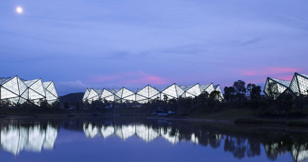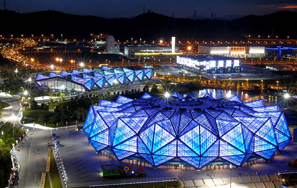 深圳大運中心體育場館率先在國內體育場館建設中引入以聚碳酸酯板(PC板)作為屋面材料面板,PC板是一種科技循環(huán)利用的高新低碳環(huán)保材料,相同厚度只有普通玻璃重量的50%,隔熱性能比普通玻璃提高了25%,沖擊強度時普通玻璃的250倍,并具有良好的透光性、抗沖擊性及耐紫外線輻射性能,同時還具有良好的尺寸穩(wěn)定性和成型加工系能。
