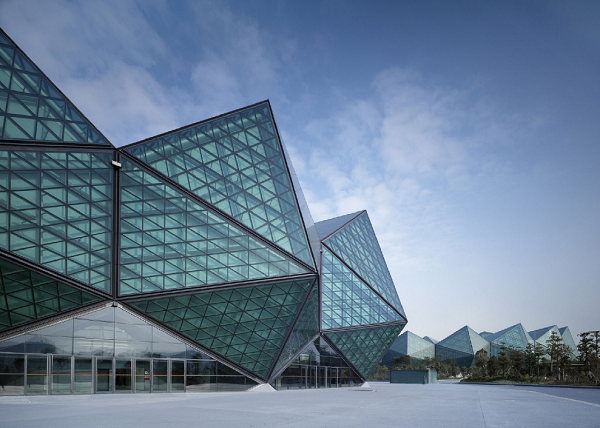 深圳大運中心體育館鋼結構屋蓋集高聳結構和大跨度空間結構于一體,由16個形狀相近的鋼結構單元構成,直徑達158米,工程用鋼量約5800噸。項目外圍護結構系統(tǒng)(屋面結構系統(tǒng)與立面幕墻系統(tǒng))總面積3.3萬平方米,由三角形鋼架、聚碳酸酯板和鋼化夾膠玻璃共同組成“水晶石”造型,內層采用玻璃纖維張拉膜。其中屋面結構系統(tǒng)由224根三角形鋼架做骨架、7776塊9393平方米的聚碳酸酯板(PC板)、10358塊17471平方米的XIR膜夾膠鋼化玻璃、6439平方米的“W”形鋁板天溝和624個自然通風及48個機械通風百葉組成。立面幕墻系統(tǒng)由144根鋼立柱組成受力支撐骨架,由2727平方米的中空LOW-E鋼化玻璃和64檔平開門組成。