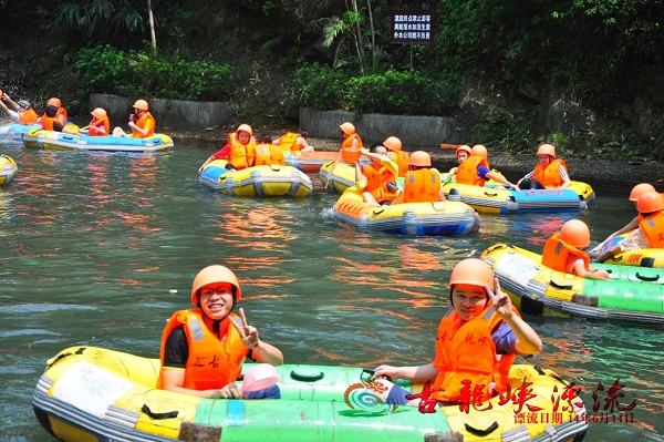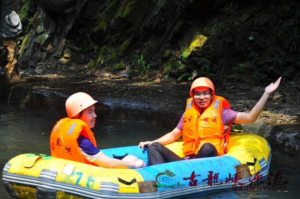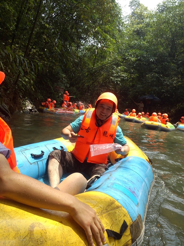 活動當(dāng)天晴空萬里,部分六月生日壽星7:40準時集合出發(fā),歷經(jīng)近4小時的車程終于到達了讓大家興奮不已的國際漂流基地——清遠古龍峽。 大家搭乘漂流點的巴士抵達漂流的起點,做好安全準備之后便兩兩組合上艇開始了漂流之旅。皮艇像浪尖上的過山車高速滑行,飛旋在波峰波谷間,驚魂未定之際又嘎然而止,橡皮艇穩(wěn)穩(wěn)躍入一個的清澈水潭里,平靜下來,尖叫聲猶在耳邊。一處處激流回旋,一道道極限落差就在一路尖叫聲中被拋在身后了?;剞D(zhuǎn)身去,油然而生的是輕舟已過萬重山的豪邁之感。