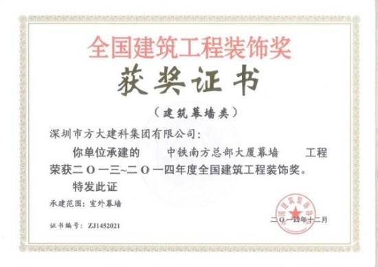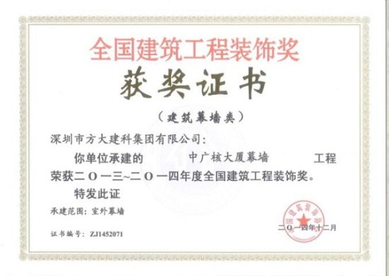 “2013-2014年度全國(guó)建筑工程裝飾獎(jiǎng)”獲獎(jiǎng)結(jié)果在北京揭曉,深圳市方大建科集團(tuán)有限公司榮獲四項(xiàng)建筑幕墻類(lèi)大獎(jiǎng),獲獎(jiǎng)項(xiàng)目分別為:中鐵南方總部大廈幕墻工程、大連萬(wàn)達(dá)公館1#樓幕墻工程、嘉里建設(shè)廣場(chǎng)二期幕墻工程、中廣核大廈幕墻工程。