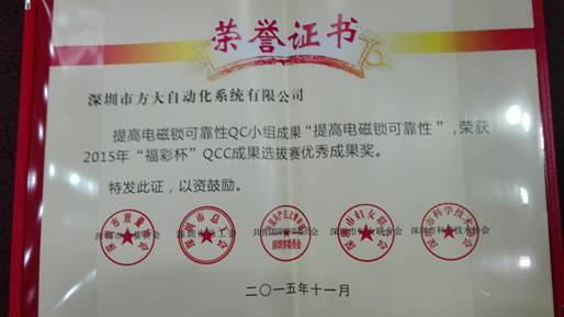 11月20日,由深圳市質(zhì)量協(xié)會(huì)、深圳市總工會(huì)、共青團(tuán)深圳市委員會(huì)、深圳市婦女聯(lián)合會(huì)和深圳市科技技術(shù)協(xié)會(huì)聯(lián)合評定的“福彩杯”優(yōu)秀QCC成果優(yōu)秀獎(jiǎng)揭曉。方大集團(tuán)股份有限公司全資子公司深圳市方大自動(dòng)化系統(tǒng)有限公司“提高電磁鎖可靠性QC小組”榮獲“深圳市2015年‘福彩杯’QCC成果選拔賽優(yōu)秀獎(jiǎng)”,自動(dòng)化公司質(zhì)量安全部黃良江榮獲“深圳市質(zhì)量管理小組活動(dòng)卓越領(lǐng)導(dǎo)者”稱號(hào)。