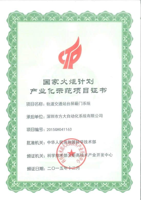 國家火炬計劃產(chǎn)業(yè)化示范項目是要求屬于國家鼓勵發(fā)展的重點振興產(chǎn)業(yè)和戰(zhàn)略性新興產(chǎn)業(yè)領域,是對“轉(zhuǎn)方式、調(diào)結(jié)構(gòu)”及地方產(chǎn)業(yè)優(yōu)化升級有帶動和示范效應的高新技術(shù)項目,有自主知識產(chǎn)權(quán)、推動產(chǎn)學研結(jié)合的科技成果產(chǎn)業(yè)化項目。方大集團“軌道交通站臺屏蔽門系統(tǒng)”被列入“國家火炬計劃產(chǎn)業(yè)化示范項目”標志著公司在自主知識產(chǎn)權(quán)、科技創(chuàng)新能力方面位列國內(nèi)企業(yè)前列,是國家科學技術(shù)部對公司科技創(chuàng)新實力的認可。