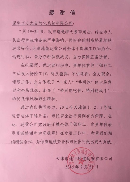近日,天津地鐵運營公司向方大自動化系統(tǒng)有限公司發(fā)來感謝信,高度評價自動化公司在天津地鐵“抗暴雨、保運營”行動中的優(yōu)良表現(xiàn)。感謝信說,
