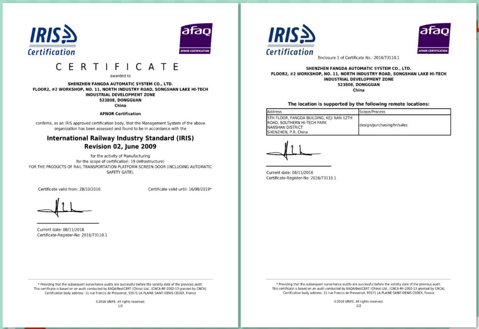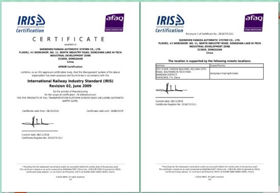 深圳市方大自動化系統(tǒng)有限公司作為全球最大的軌道交通屏蔽門系統(tǒng)供應(yīng)商,導(dǎo)入IRIS經(jīng)營管理體系是公司與世界先進(jìn)管理方法接軌的必要舉措。IRIS管理體系認(rèn)證證書的獲得,是獨(dú)立的第三方機(jī)構(gòu)對方大自動化公司的管理體系符合國際鐵路行業(yè)統(tǒng)一規(guī)范標(biāo)準(zhǔn)的認(rèn)可。通過IRIS經(jīng)營管理體系認(rèn)證,意味著方大自動化公司的管理體系接軌世界先進(jìn)管理方法,在ISO9000基礎(chǔ)上進(jìn)一步提升企業(yè)的整體管理水平。在取得IRIS管理體系認(rèn)證證書后,方大自動化公司的相關(guān)認(rèn)證信息將由IRIS管理中心錄入IRIS門戶網(wǎng)站認(rèn)證信息庫進(jìn)行統(tǒng)一管理,同時可供全球鐵路行業(yè)客戶進(jìn)行檢索、瀏覽,這為方大自動化公司拓展市場領(lǐng)域、獲取更多的國際訂單提供了強(qiáng)有力的保障。