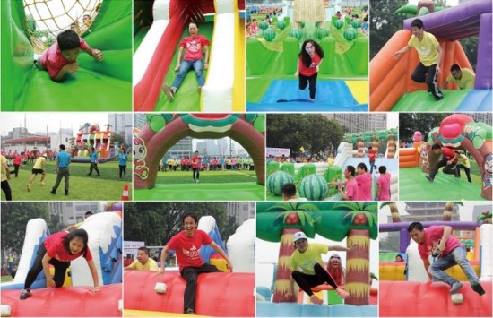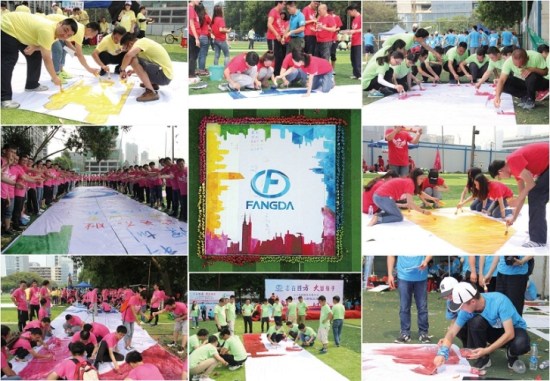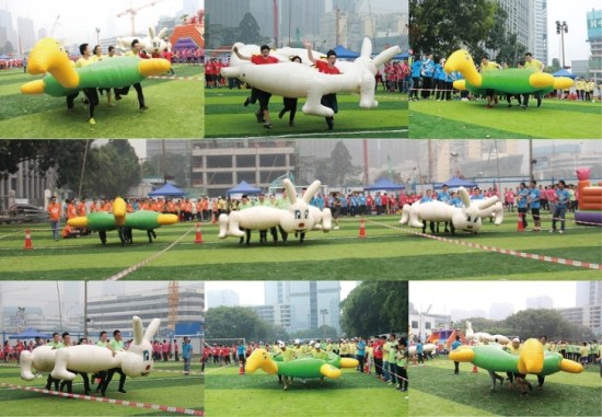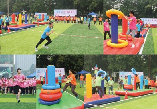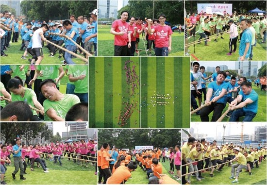 本次運動會設置了龜兔賽跑、超級漢諾塔、快樂gogogo、趣味拔河、納斯卡巨畫等趣味項目,比賽場上處處充滿著歡聲笑語,大家玩得不亦樂乎!在龜兔賽跑環(huán)節(jié),各代表隊的隊員們分別頂著巨型充氣“烏龜”、“兔子”笑著跑著,奮力競爭,爭取最好的比賽成績;在超級漢諾塔環(huán)節(jié),考驗的不僅有團隊成員的運動能力,還有團隊內部的組織協(xié)作效率;在快樂gogogo環(huán)節(jié),更是掀起了所有參賽員工的火熱激情,他們在氣墊城堡中穿梭、攀爬、滑行、滾動,在回味和體驗孩童時代樂趣的同時,為自己的團隊爭取好的名次;趣味拔河環(huán)節(jié)是這次運動會的最高潮,只見加油的叫喊聲震天動地,拔河的隊員無不神態(tài)激越,使出渾身之力,將拔河繩拉得吱吱地響;最后是納斯卡巨畫環(huán)節(jié),參與運動會的全體員工一同用五顏六色的油彩,分工合作,共同繪出印有方大集團logo的巨型圖畫。通過百米高空上無人機的航拍我們看到,在530余名方大人簇擁中的方大logo巨畫,在燦爛陽光的照耀下,正閃閃發(fā)光,正如她在行業(yè)中的響亮知名度一樣。