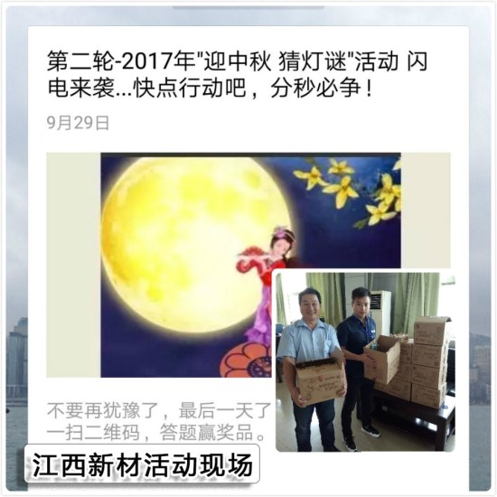 在方大集團江西公司,9月28日、29日舉行了一次別開生面的“迎中秋猜燈謎”線上活動。為了讓公司員工感受到節(jié)日濃厚的氣氛,同時又能搭建企業(yè)文化交流的橋梁,此次活動由傳統(tǒng)猜燈謎改為微信猜燈謎方式進行。員工們通過關注公司微信公眾號后,即可在線參與解答猜燈謎的活動。通過這次“迎中秋猜燈謎”活動,極大地激發(fā)了員工們關注公司微信公眾平臺的激情,也為員工們留下了一段難忘的節(jié)日回憶。
