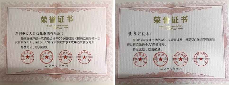 11月14日,深圳市第三十屆優(yōu)秀質(zhì)量管理小組活動表彰大會在深圳市建科院舉行,方大集團(tuán)股份有限公司全資子公司深圳市方大自動化系統(tǒng)有限公司“提高立柱焊接一次交驗合格率QC小組”榮獲“2017年深圳市優(yōu)秀QCC成果選拔賽優(yōu)秀獎”,自動化公司質(zhì)量安全部黃良江榮獲“深圳市質(zhì)量信得過班組先進(jìn)個人”榮譽稱號。