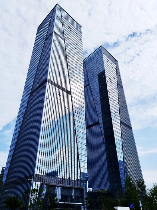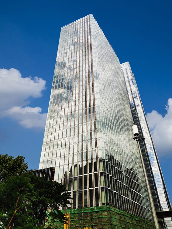 深圳·萬科濱海置地大廈位于深圳市福田區(qū),幕墻類型主要是鋸齒狀單元式玻璃+石材+穿孔鋁板幕墻。項目塔樓采用L型和I型單元板塊組成,面板采用蜂窩石材、中空夾膠玻璃和穿孔鋁板。為了增強幕墻系統(tǒng)的通風(fēng)性能,在穿孔鋁板后側(cè)設(shè)置了內(nèi)開的鋁板窗。鋸齒狀的幕墻類型和特色材料的組合使該項目成為濱河大道上的一道靚麗風(fēng)景,同時也給設(shè)計施工帶來了難題,項目團隊通過三維模擬確保L型板塊與I型板塊精確插接,對使用高度157m的蜂窩石材連接方案進行了加強措施,并順利通過幕墻專家專項的評審。