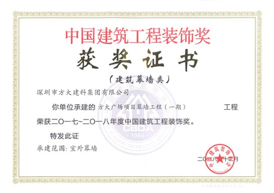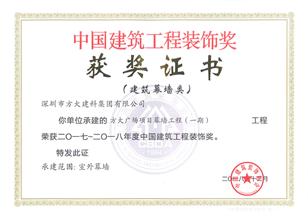 中國建筑工程裝飾獎是由中國建筑裝飾協(xié)會主辦的評選活動,自2001年起每年進(jìn)行評選,是建設(shè)部批準(zhǔn)設(shè)立的中國建筑裝飾行業(yè)的最高榮譽獎。方大建科承建的四項幕墻工程獲此獎項,是對公司精湛的幕墻設(shè)計能力和先進(jìn)的施工工藝的充分肯定。