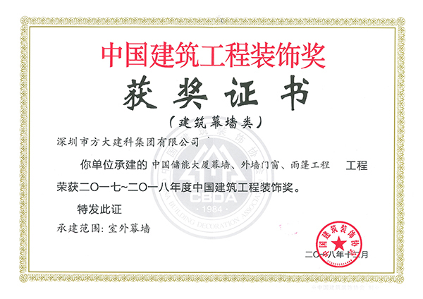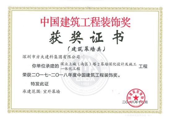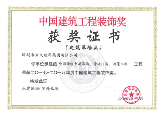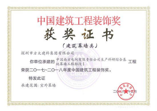 近日,中國建筑裝飾協(xié)會頒發(fā)了2017-2018年度中國建筑工程裝飾獎的獲獎證書,方大集團(tuán)股份有限公司全資子公司深圳市方大建科集團(tuán)有限公司承建的四項幕墻工程榮獲中國建筑工程裝飾獎——方大廣場(一期)、深業(yè)上城(南區(qū))塔2、中國儲能大廈、中國南方電網(wǎng)有限責(zé)任公司生產(chǎn)科研綜合基地。