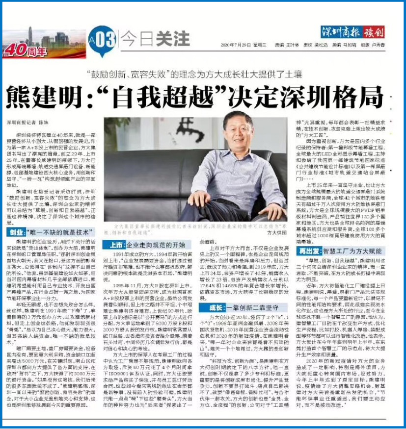 深圳經(jīng)濟(jì)特區(qū)建立40年來,就是一部民營經(jīng)濟(jì)從小到大、從弱到強(qiáng)的發(fā)展史。作為首批A+B股上市的民營企業(yè),方大集團(tuán)書寫出了漂亮的篇章。創(chuàng)立29年、上市25年,在董事長熊建明的帶領(lǐng)下,方大已形成高端幕墻、軌道交通屏蔽門設(shè)備、新能源、總部基地建設(shè)四大核心業(yè)務(wù),用創(chuàng)新和堅(jiān)守、“一磚一瓦”構(gòu)筑起領(lǐng)跑產(chǎn)業(yè)的牢固地位。