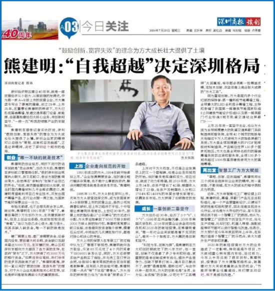 “草根、創(chuàng)新、自我超越”,熊建明用這三個(gè)詞來總結(jié)深圳企業(yè)家的精神。而一直進(jìn)取、不斷突破,在方大的成長歷程中表現(xiàn)尤為明顯。
