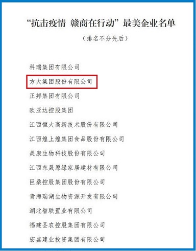 近日,江西贛商聯(lián)合總會、贛商雜志社發(fā)布關(guān)于表彰在“抗擊疫情 贛商在行動”活動中最美商會、最美企業(yè)、最美企業(yè)家的通報,表彰贛商企業(yè)和江西商會在抗擊疫情中做出的突出貢獻(xiàn),方大集團榮獲最美企業(yè)稱號。