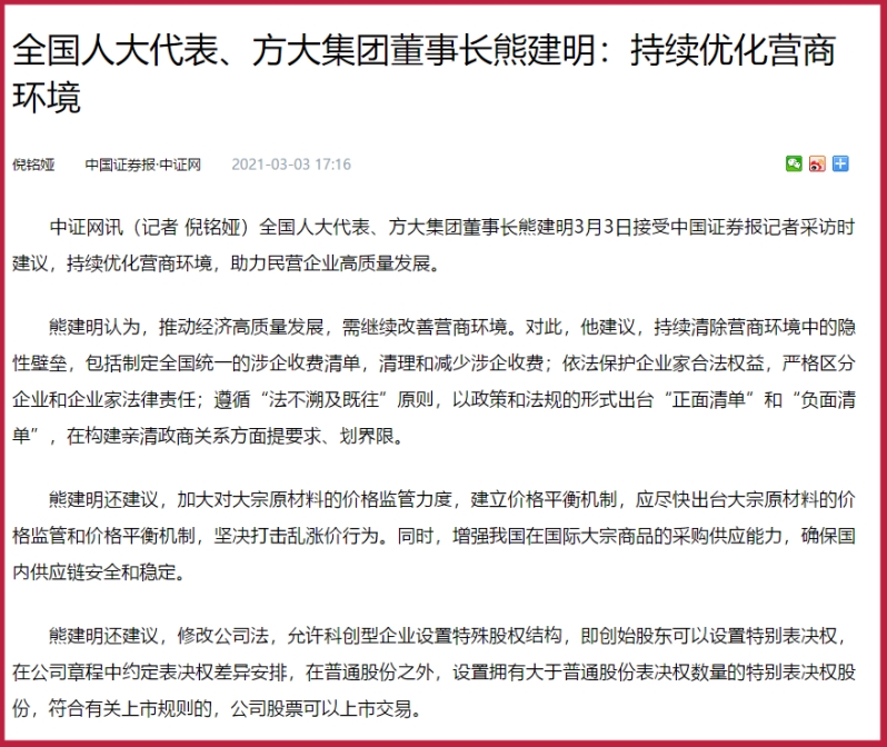 全國人大代表、方大集團董事長熊建明3月3日接受中國證券報記者采訪時建議,持續(xù)優(yōu)化營商環(huán)境,助力民營企業(yè)高質(zhì)量發(fā)展。
