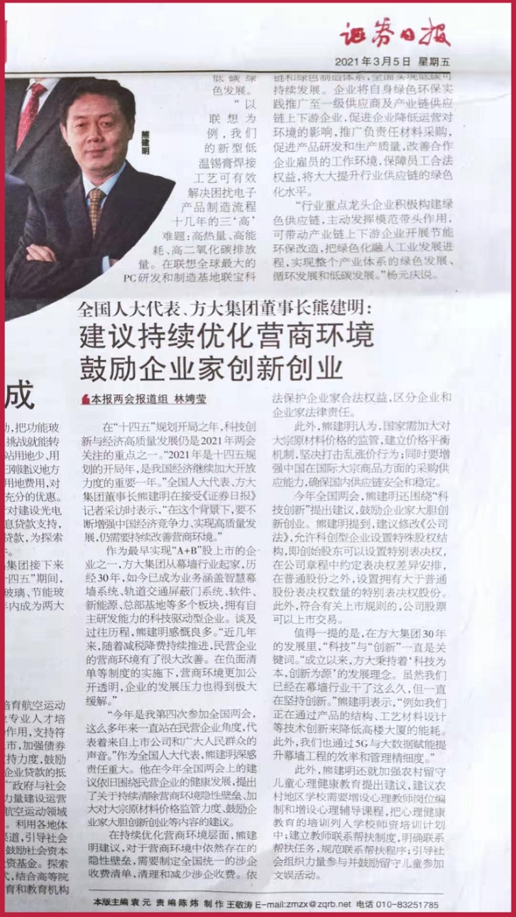 在“十四五”規(guī)劃開局之年,科技創(chuàng)新與經(jīng)濟高質(zhì)量發(fā)展仍是2021年兩會關(guān)注的重點之一?!?021年是十四五規(guī)劃的開局年,是我國經(jīng)濟繼續(xù)加大開放力度的重要一年?!比珖舜蟠怼⒎酱蠹瘓F董事長熊建明在接受《證券日報》記者采訪時表示,“在這個背景下,要不斷增強中國經(jīng)濟競爭力、實現(xiàn)高質(zhì)量發(fā)展,仍需要持續(xù)改善營商環(huán)境。”