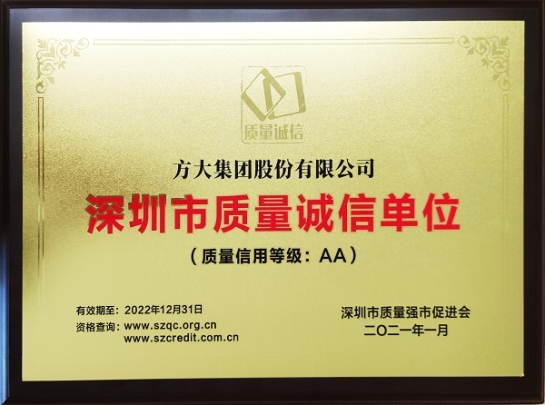 近日,深圳市質(zhì)量強(qiáng)市促進(jìn)會(huì)公布了質(zhì)量誠信(示范)單位認(rèn)定名單,方大集團(tuán)獲得“深圳市質(zhì)量誠信單位”認(rèn)證。
